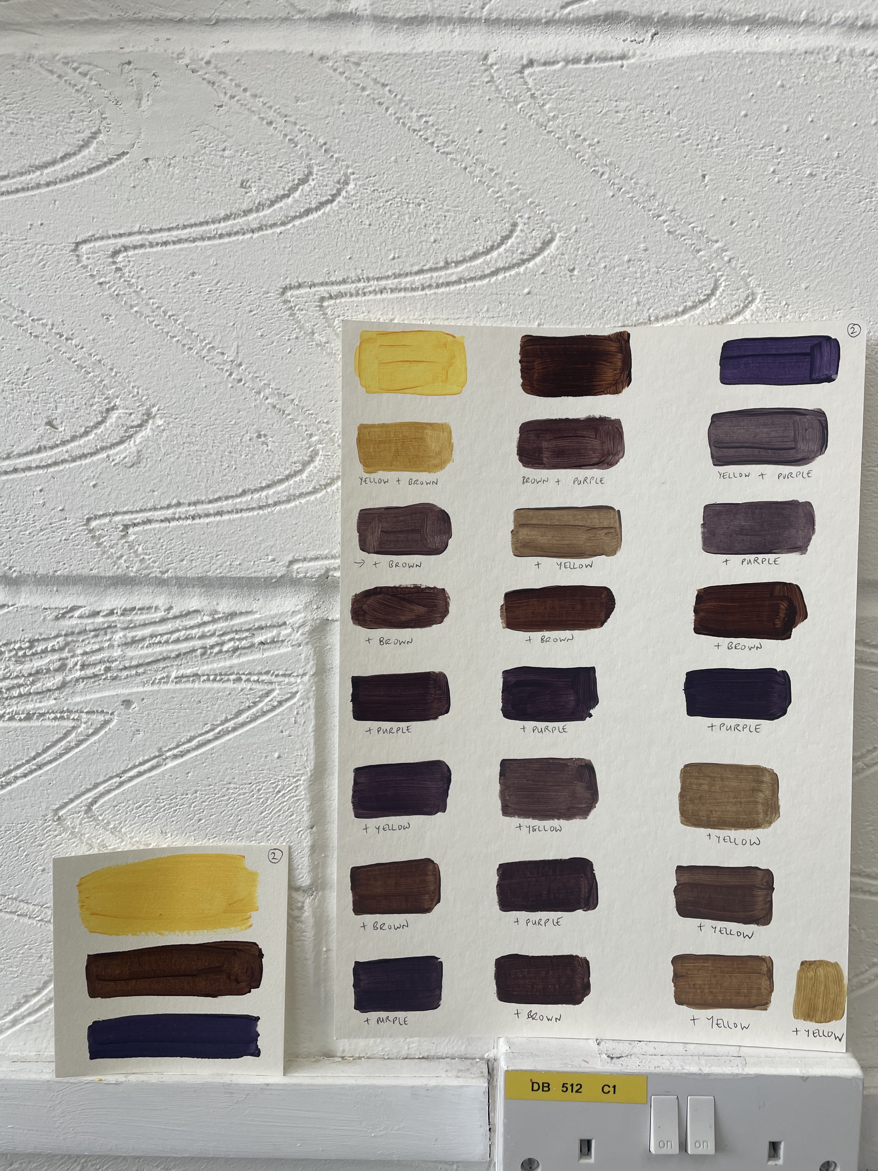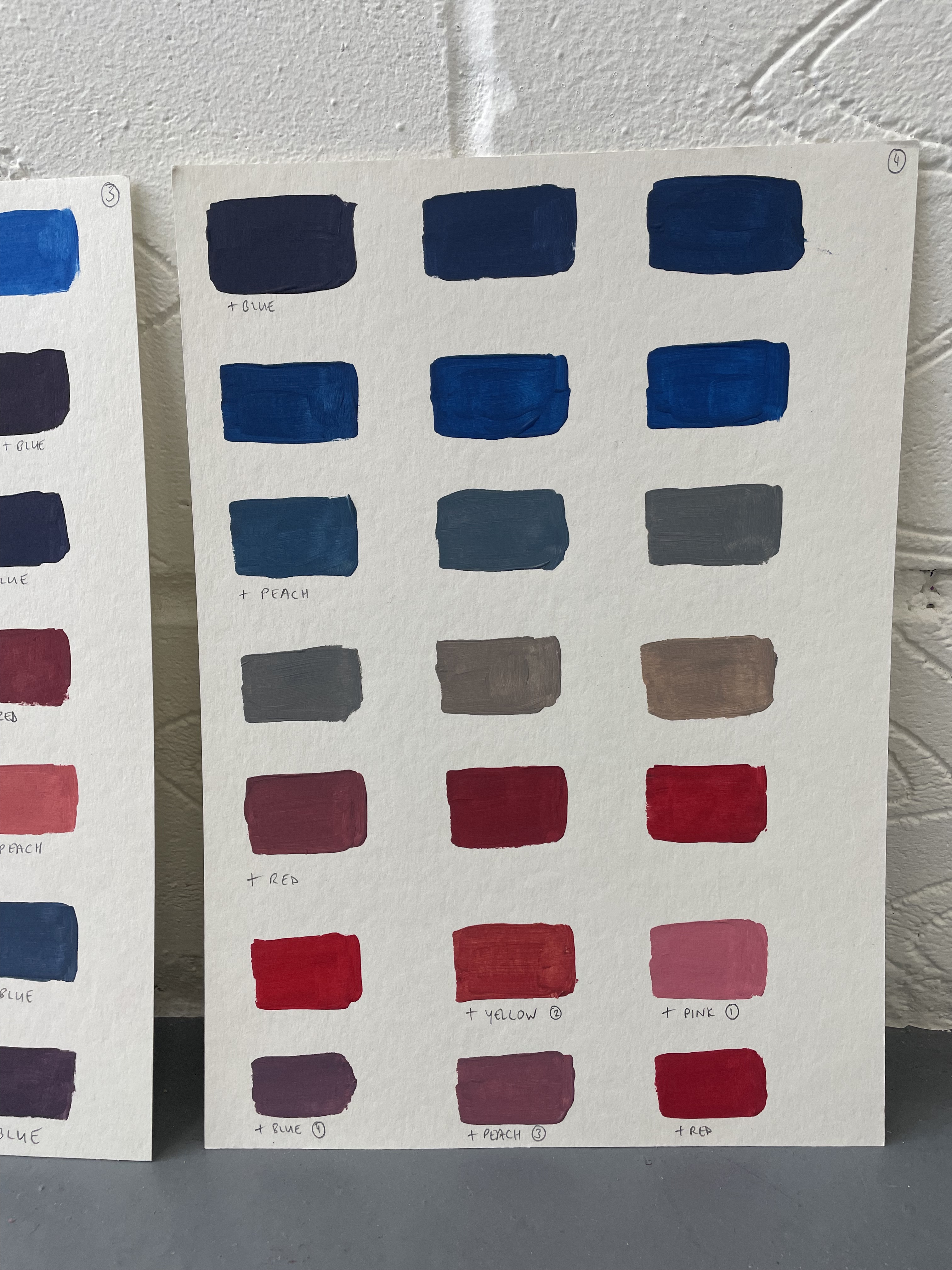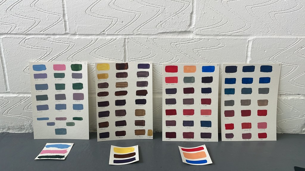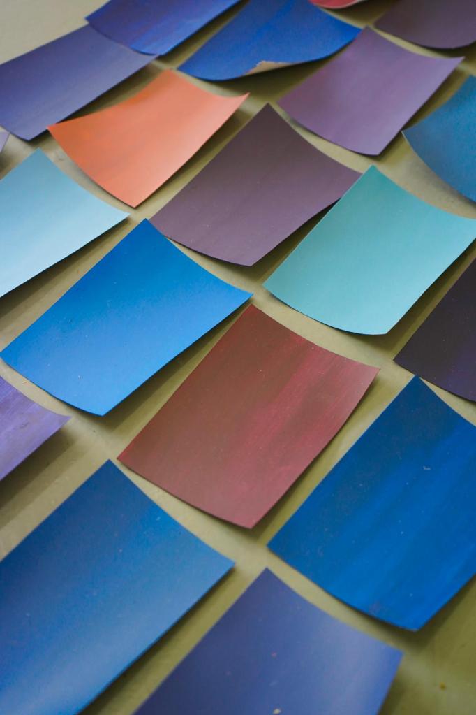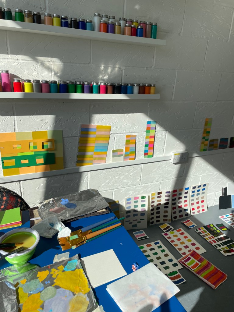 A studio staple in my practice is making colour as exercises that ease me out of a creative block or into exploring a particular palette range for a piece of work or as studies. Creating these swatches under different ‘conditions’, in an altogether different environment (both immediate and wider), with headspace being free to simply explore, was the beginning of creating work over the next few days that I didn’t know I had in me.