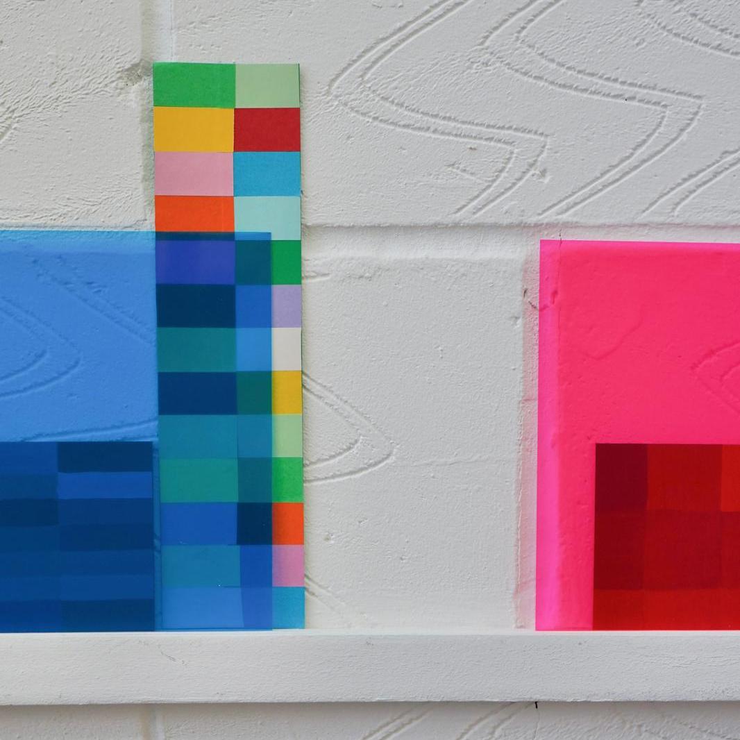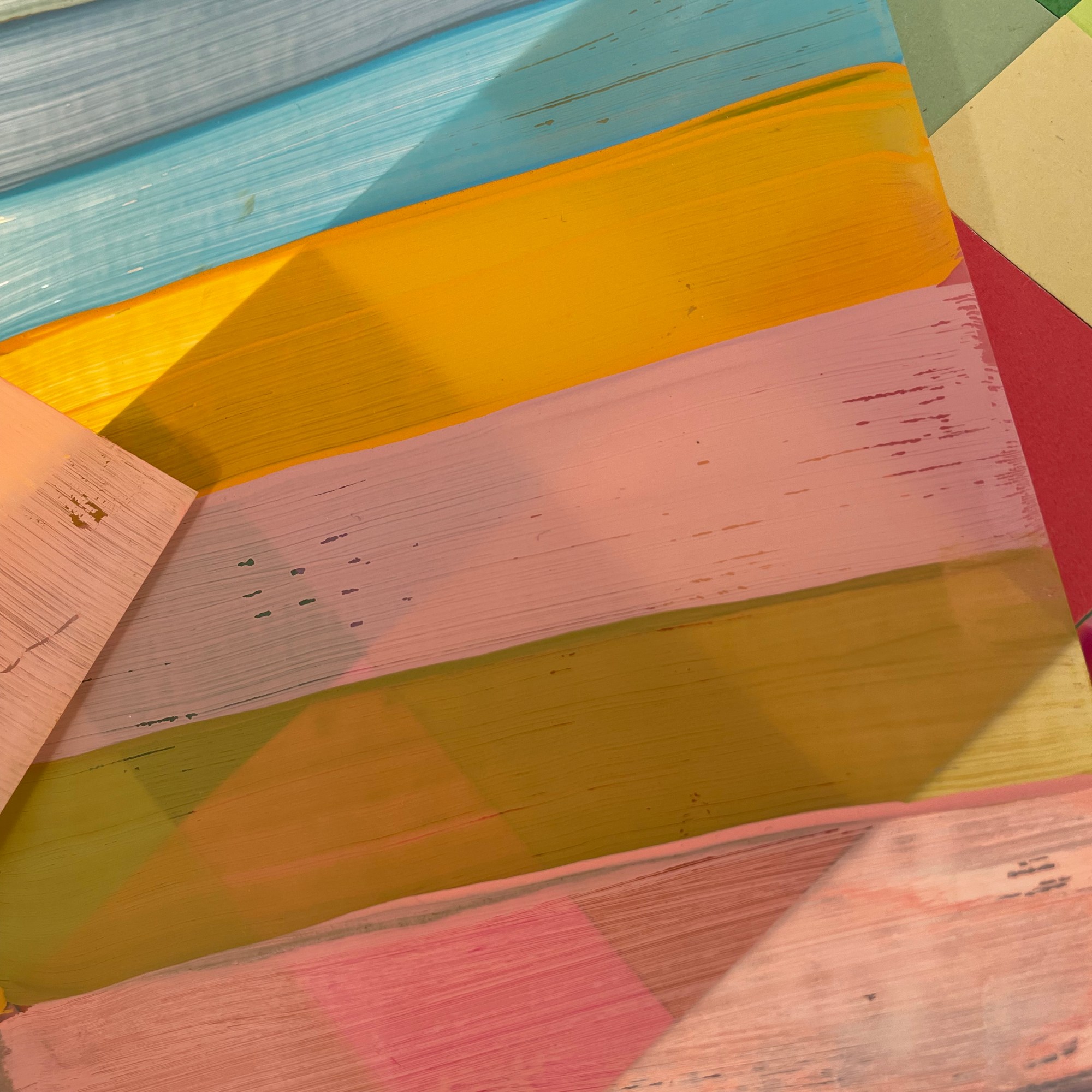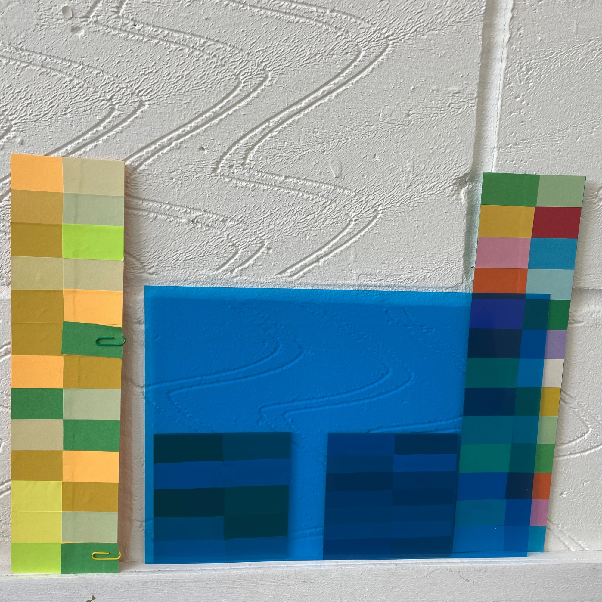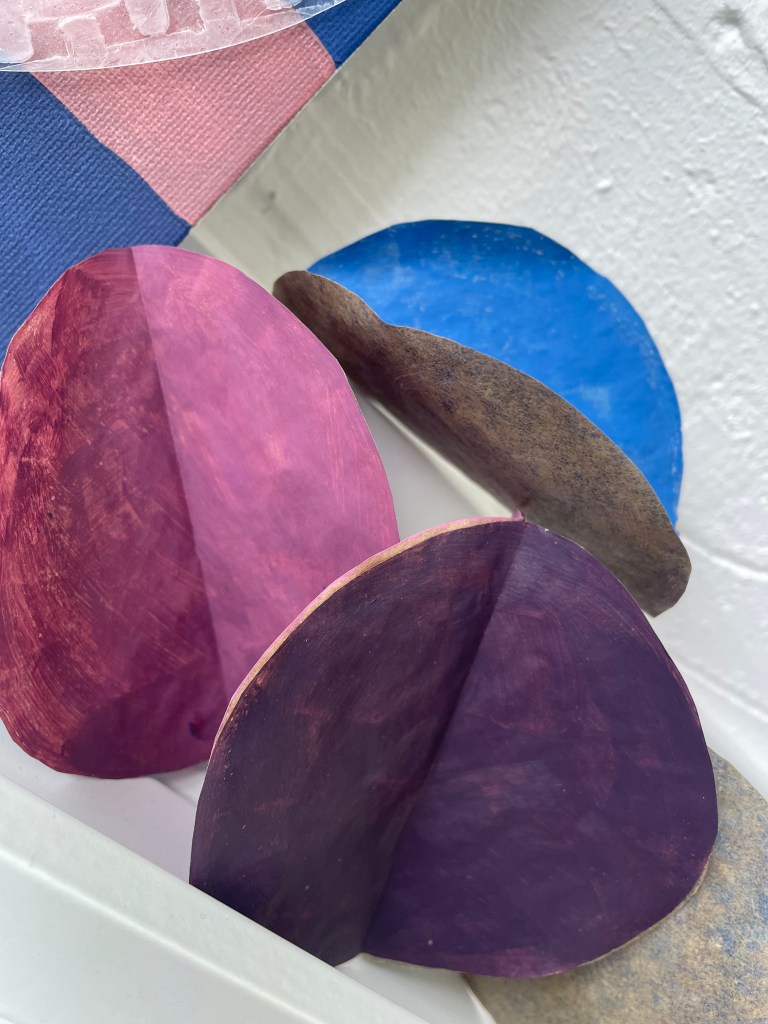 The work organically unfurled and evolved with the thinking, creating, conversations and reading all working in tandem, and my subconscious revealing what I was always meant to be making in these days. I looked at layering over the colour swatches with coloured acetates, playing with sunlight to reveal new shades, shadow play, therefore making more questions from the work – what else is being created within these pieces? what emotions are being evoked from the colour/light play? could they be shaped into three dimensional forms?
