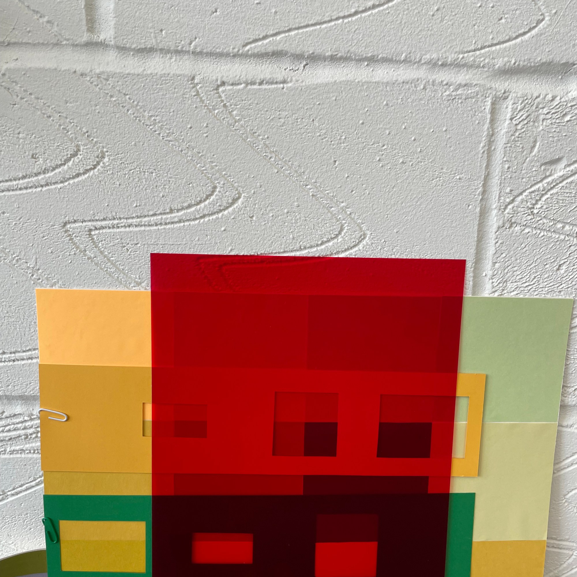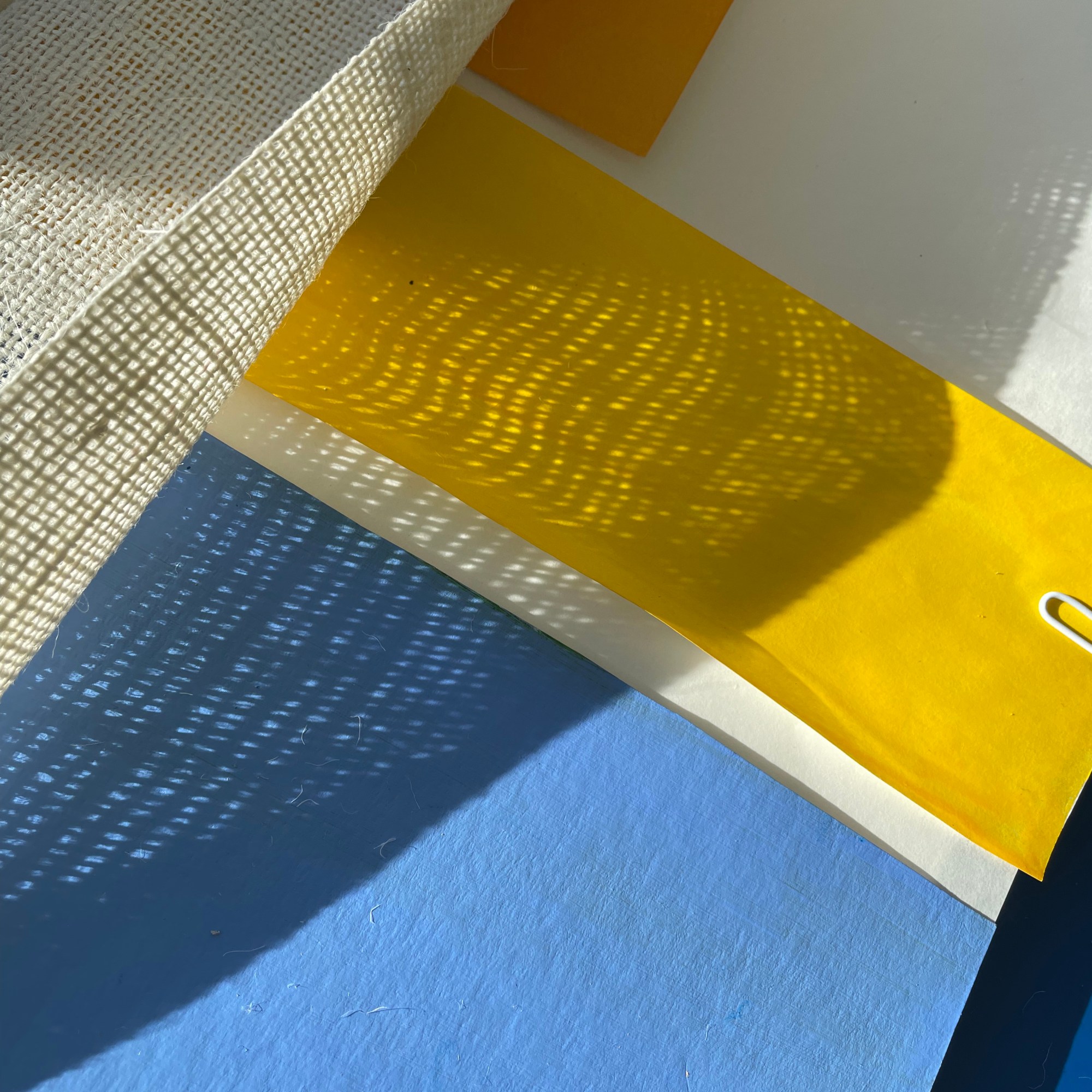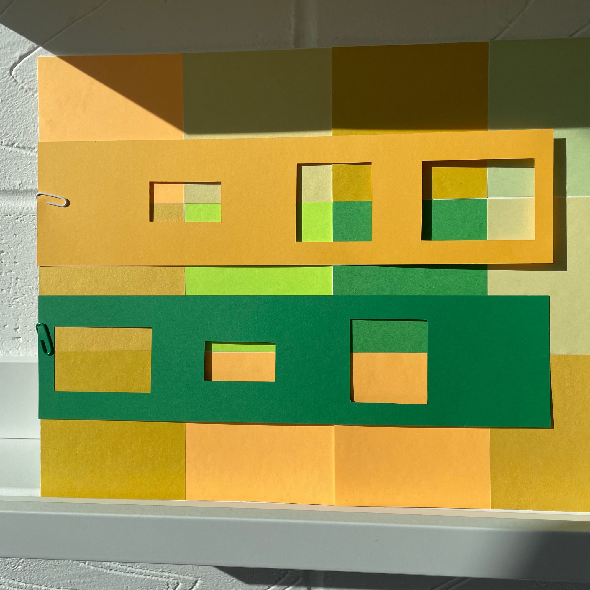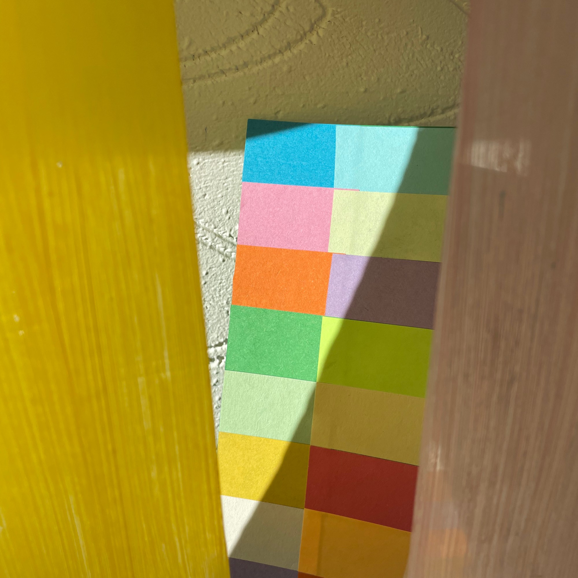 The work organically unfurled and evolved with the thinking, creating, conversations and reading all working in tandem, and my subconscious revealing what I was always meant to be making in these days. I looked at layering over the colour swatches with coloured acetates, playing with sunlight to reveal new shades, shadow play, therefore making more questions from the work – what else is being created within these pieces? what emotions are being evoked from the colour/light play? could they be shaped into three dimensional forms?