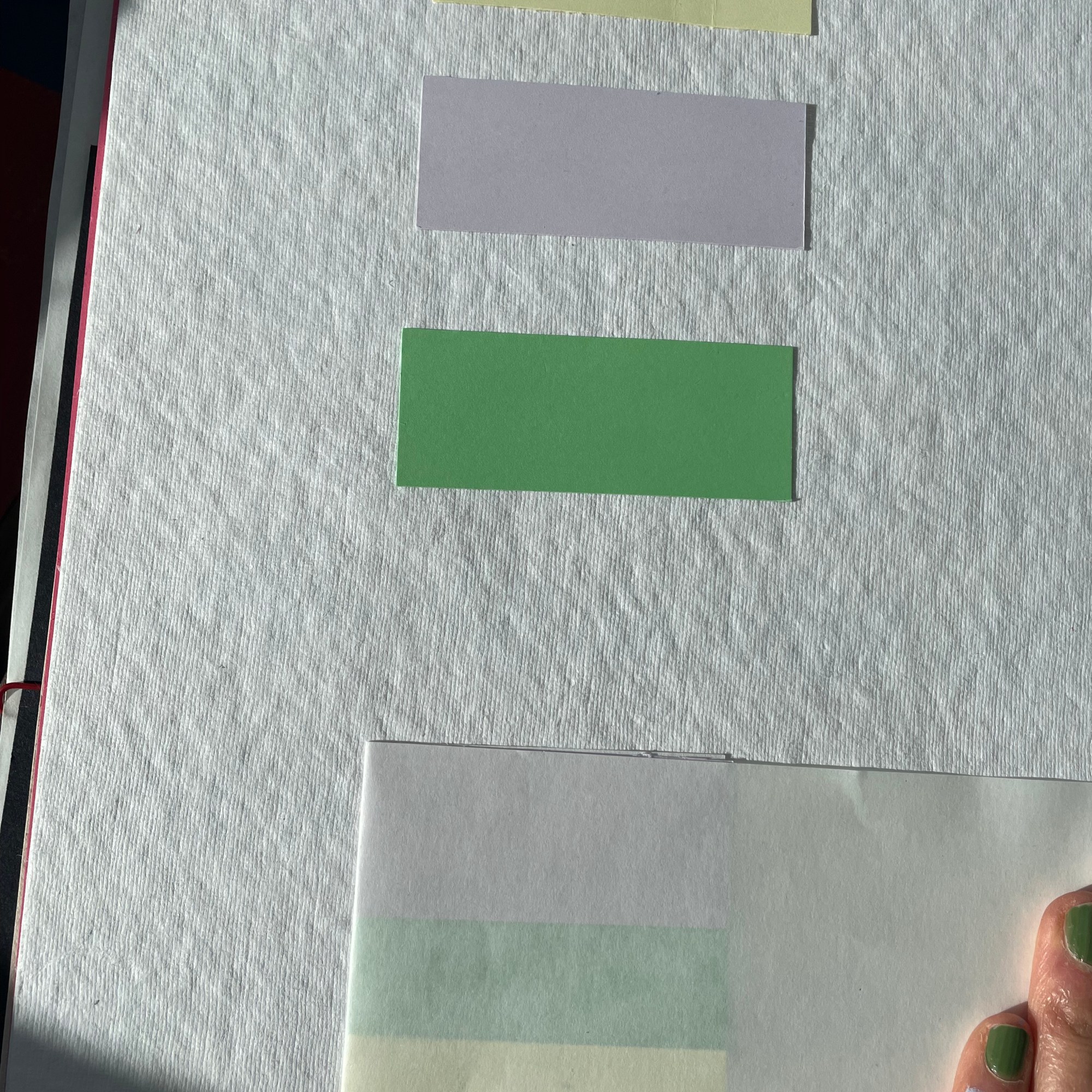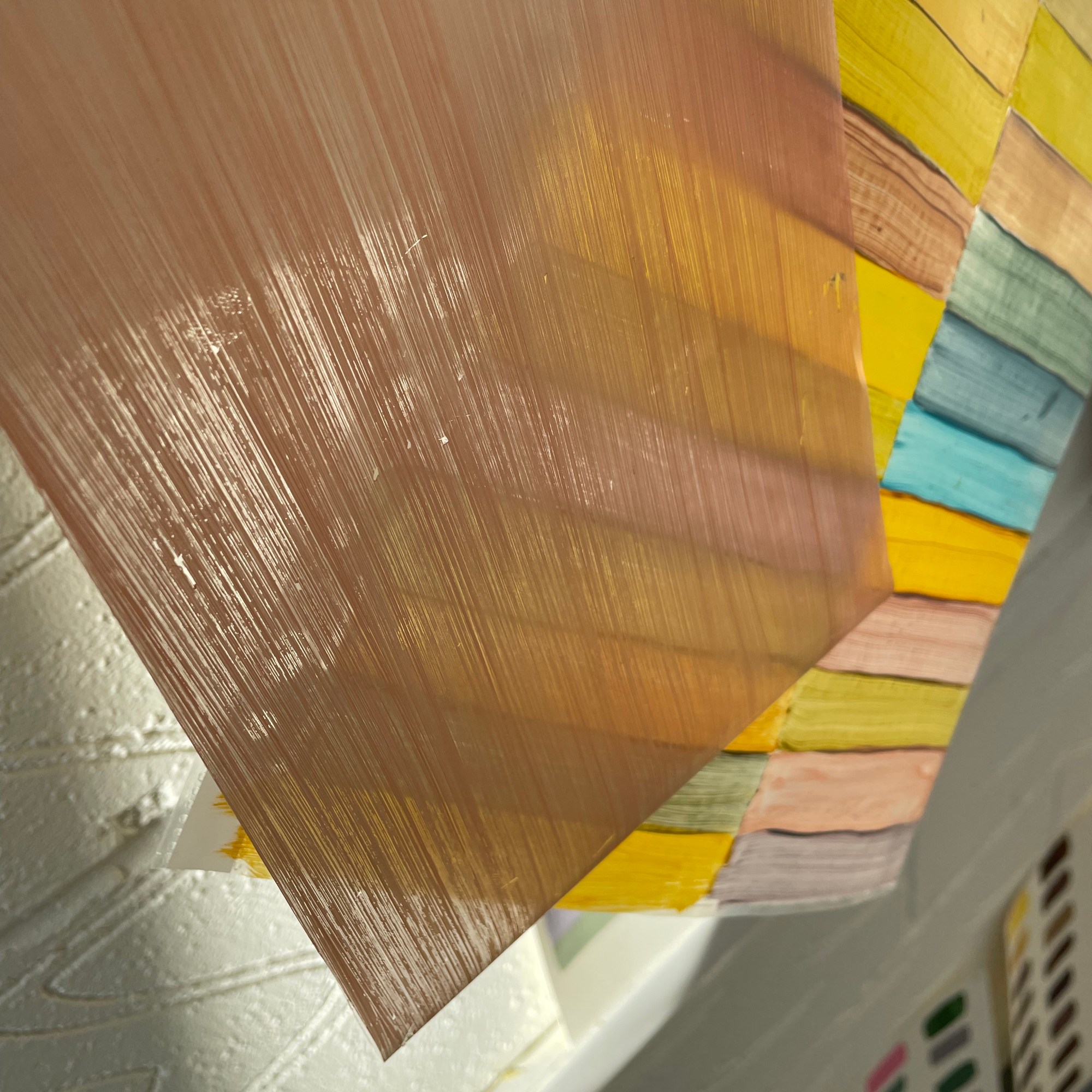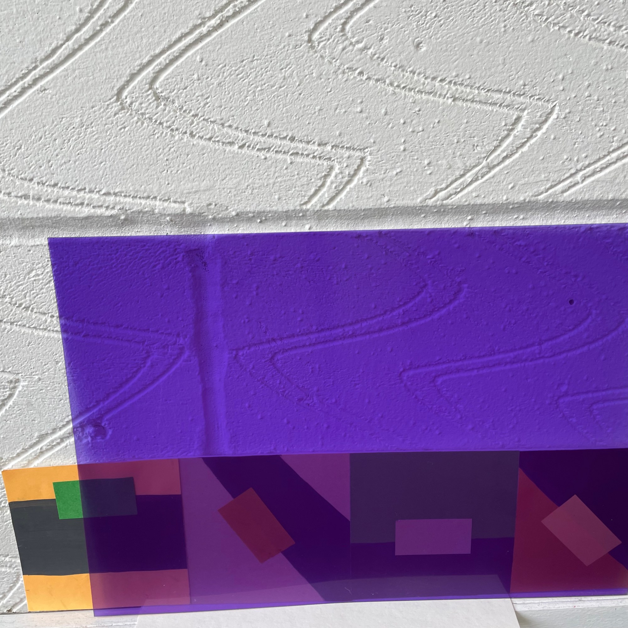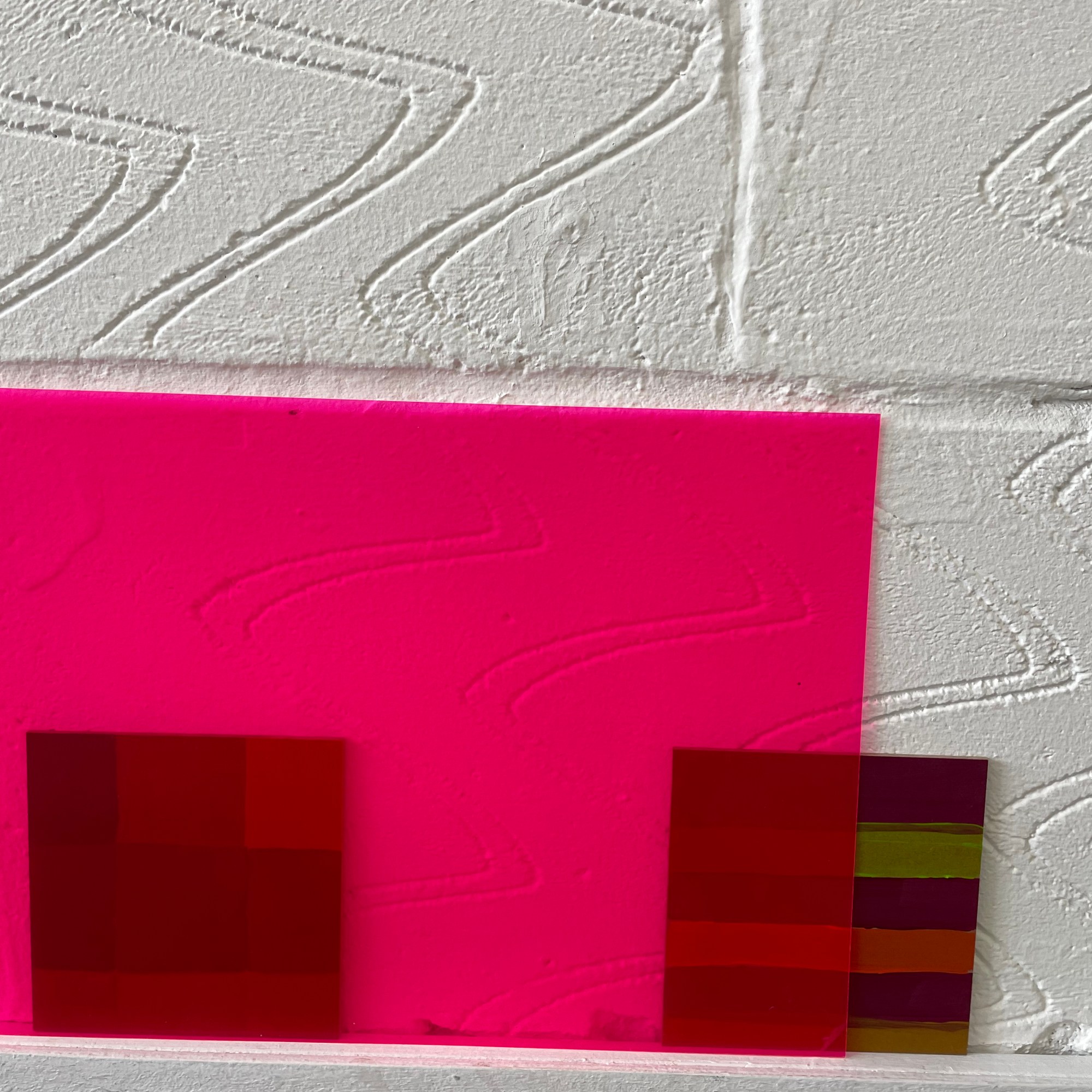 The work organically unfurled and evolved with the thinking, creating, conversations and reading all working in tandem, and my subconscious revealing what I was always meant to be making in these days. I looked at layering over the colour swatches with coloured acetates, playing with sunlight to reveal new shades, shadow play, therefore making more questions from the work – what else is being created within these pieces? what emotions are being evoked from the colour/light play? could they be shaped into three dimensional forms?