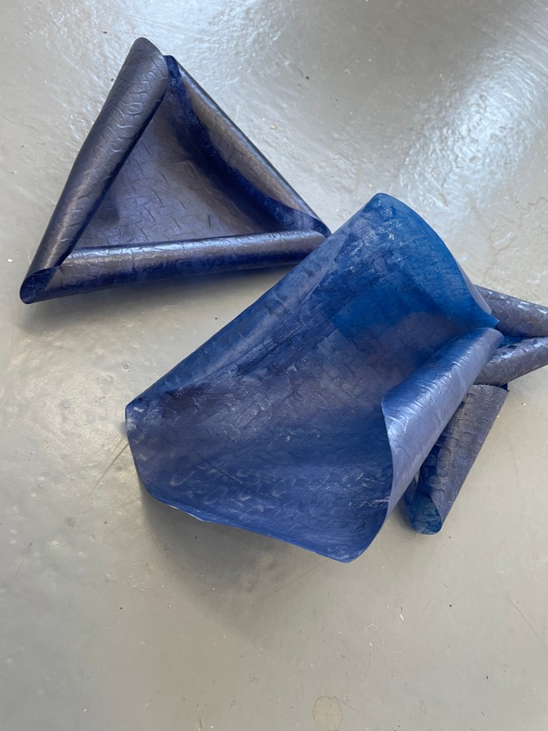 I was surprised at how naturally these exercises informed my current research project, Empire of Plants, about the history of colour told through plants used for pigments during the global trade in the 1800’s. Leafing through pages of writings, travelling from book to book, I began to examine the colours Indigo and Gamboge more closely, painting specific colour-related palettes, experimenting with mediums and surfaces that welcomed wider but localised thinking to the process. I painted on rice paper, baking paper, and sculpted both into forms. I made flower books. I created a large scale indigo palette installation where the shadows, curled up corners of the paper and the installation format invited questions relating to farmed landscapes as cash crops in countries adversely affected by global trade, and long term thinking into the affects of those actions that continue to reverberate today.