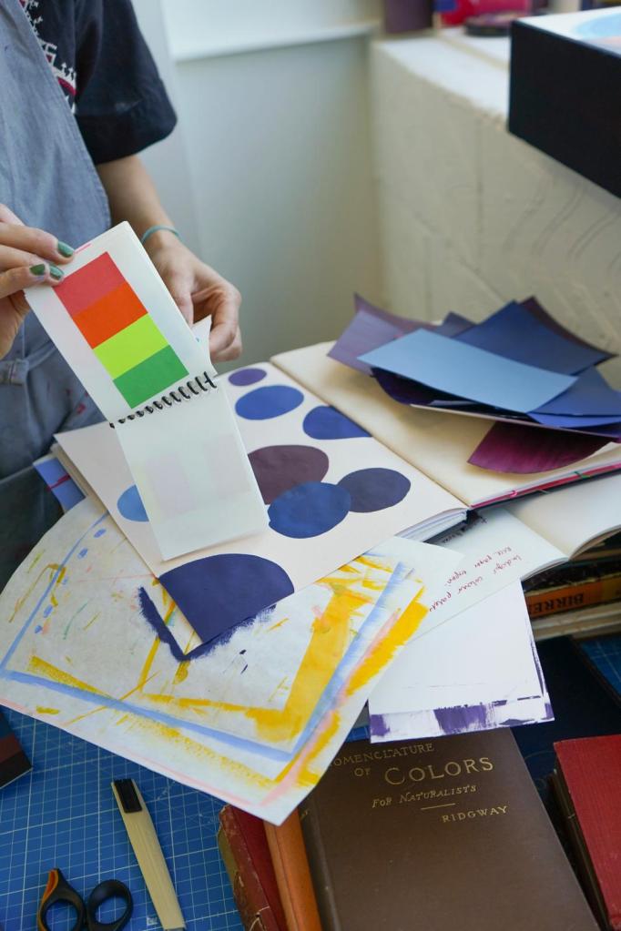 I made a LOT of work that I ended up posting it back to Leicester! All the initial pressures I placed on myself fast fell to the wayside over those seven days. The Residency, as short a time as it was, has been a pivotal, impactful life experience – it amazes me how we are capable of absorbing experiences as if they have been a part of us for a long time; that to me just affirms I was always meant to be here, doing this. My time surrounded in the library of books ranging from the incredibly rare to the modern, drew me in to look at colour through different channels of inspiration, some unrelated to my practice. I was led to explore colour without inhibition, be led by my individual thought process, creating the magical pause between colour and paint studies to reflect without specific outcome, to breathe fresh perspective into how I approach colour with alternative mediums and dimensions. To play.